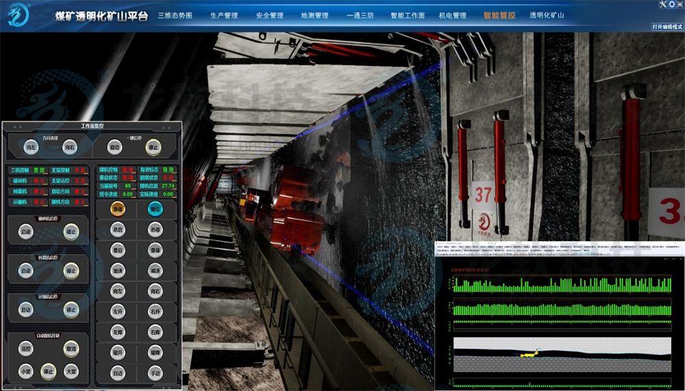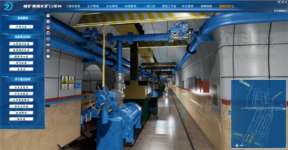 (3)支持?jǐn)?shù)字孿生礦山管控應(yīng)用?;贕IS+BIM+VR技術(shù)和統(tǒng)一的大地坐標(biāo)系,實(shí)現(xiàn)了地質(zhì)模型、設(shè)備模型、開(kāi)采環(huán)境與機(jī)電設(shè)備控制之間的拓?fù)浜瓦壿嬯P(guān)系的一體化集成,為智能化控制提供可視化地理環(huán)境。