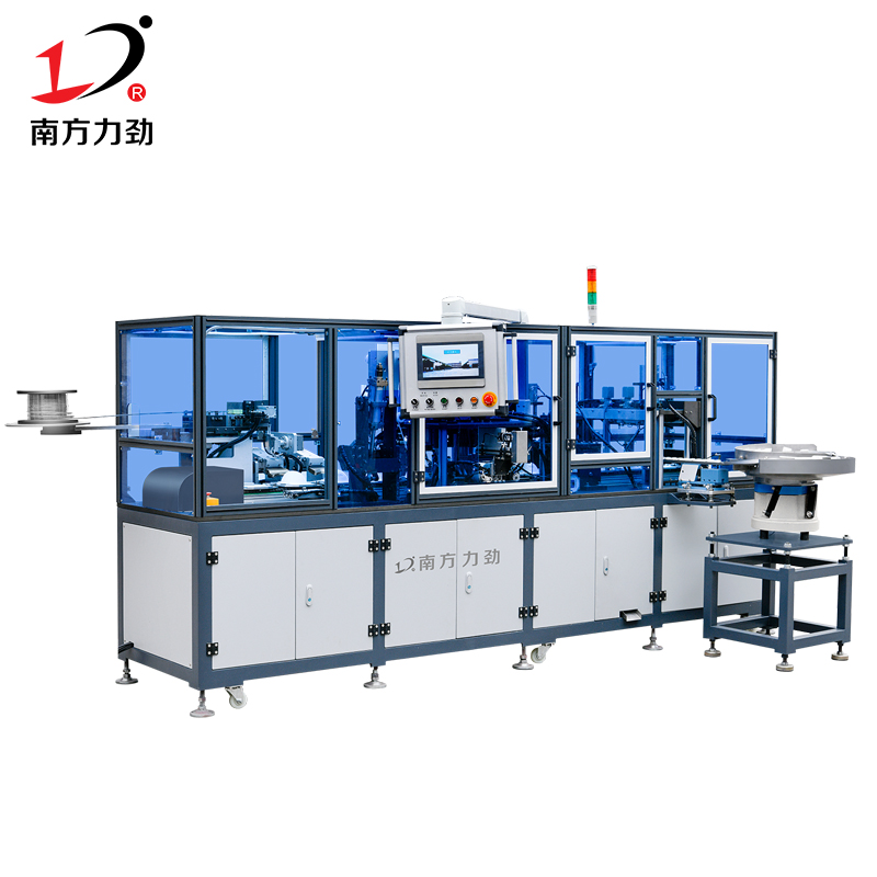 南方力勁分段全自動杯型口罩機,主要有3部份組成,第一部份全自動4料定型機,第二部份轉盤式口罩熔切機,第三部份后段全自動機。