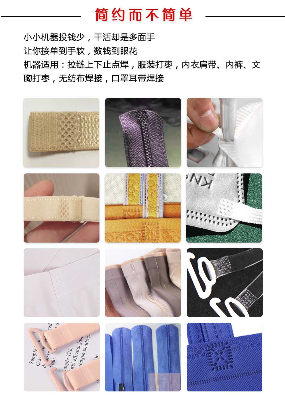 無論是燙拉鏈尾、拉鏈頭,還是織帶絲帶點焊,細繩帶疊焊,甚至內(nèi)衣內(nèi)褲和鞋面的定位點焊,您都需要一臺穩(wěn)定可靠的超聲波點焊機。讓我們來介紹一下這款業(yè)內(nèi)公認最好用,最穩(wěn)定的超聲波點焊機。