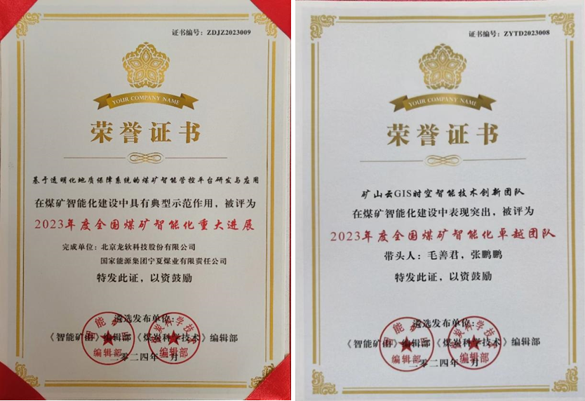龍軟科技受邀參加會議并獲得兩項榮譽,其中“基于透明化地質(zhì)保障系統(tǒng)的煤礦智能管控平臺研發(fā)與應用”被評為2023年度全國煤礦智能化重大進展,“礦山云GIS時空智能技術創(chuàng)新團隊”被評為2023年度全國煤礦智能化卓越團隊。