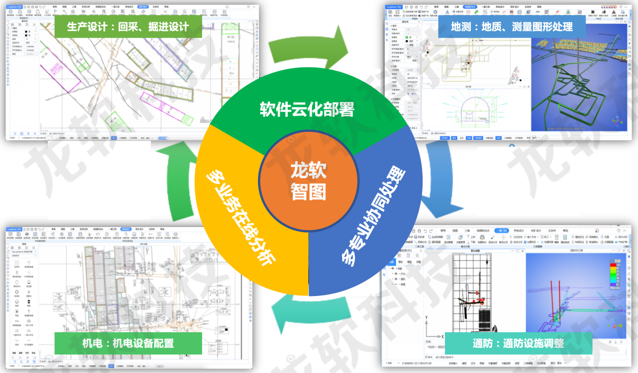 除了專業(yè)機電設備和環(huán)境監(jiān)測系統(tǒng)的生產(chǎn)外,龍軟科技-北大團隊已經(jīng)成為國內(nèi)外煤礦智能化建設自主產(chǎn)業(yè)鏈較為完整的團隊之一,從采掘透明化探測、礦山“采、掘、機、運、通”和“水、火、瓦斯、頂板”多維專題圖形的處理、透明化地測保障系統(tǒng)、基于透明化地測的管控平臺,到智能化綜掘、智能化綜采、智能化通風、智能化洗選,都有專門的研發(fā)和實施團隊,而且成果眾多。智能化礦山建設產(chǎn)業(yè)鏈的重要基礎是透明化地測保障系統(tǒng),而透明化地測保障系統(tǒng)的基礎就是能夠處理各類專題圖形的GIS軟件系統(tǒng)。