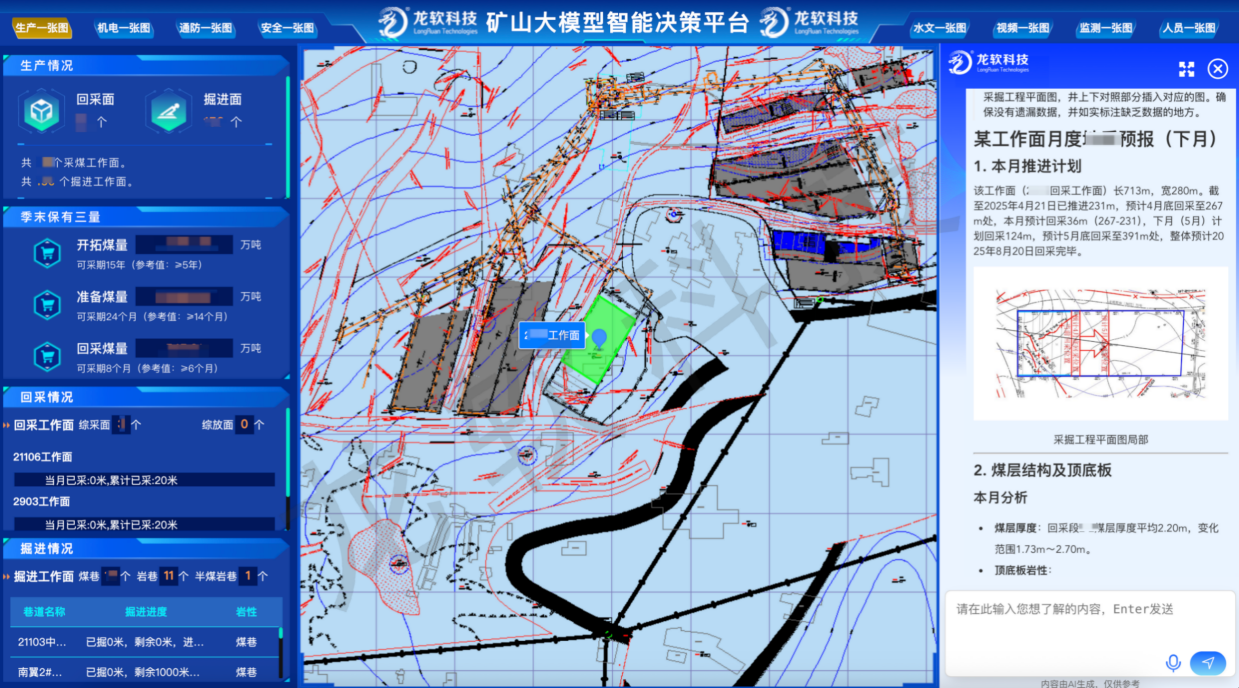 龍軟時(shí)空大模型是公司依托多年的AI技術(shù)研發(fā)和礦山行業(yè)應(yīng)用經(jīng)驗(yàn)積累,基于已授權(quán)的數(shù)項(xiàng)發(fā)明專利,融合包括DeepSeek在內(nèi)的先進(jìn)通用大語(yǔ)言模型和自主研發(fā)的時(shí)空智能技術(shù),研發(fā)推出的跨越感知、認(rèn)知、執(zhí)行等多維度、多模態(tài)等人工智能技術(shù)體系。該技術(shù)解決了大模型在礦山行業(yè)知識(shí)嵌入不足、無(wú)法處理矢量時(shí)空數(shù)據(jù)等短板,支持接入礦井內(nèi)部各類安全、生產(chǎn)、運(yùn)輸、經(jīng)營(yíng)等動(dòng)態(tài)數(shù)據(jù)以及礦井自有技術(shù)資料、專家經(jīng)驗(yàn)等知識(shí),實(shí)現(xiàn)基于時(shí)空大模型的智能決策分析系統(tǒng),提供面向礦山各類應(yīng)用場(chǎng)景的視覺(jué)智能識(shí)別、專業(yè)知識(shí)問(wèn)答、圖形智能處理、業(yè)務(wù)綜合決策等能力,其中視頻AI分析已覆蓋9大類、86小類場(chǎng)景模型,并結(jié)合多智能體封裝管控業(yè)務(wù)流程,實(shí)現(xiàn)礦山生產(chǎn)調(diào)度、安全評(píng)價(jià)、輔助決策相關(guān)的“智能看圖、智能問(wèn)數(shù)、智能監(jiān)控、智能分析決策”等應(yīng)用。