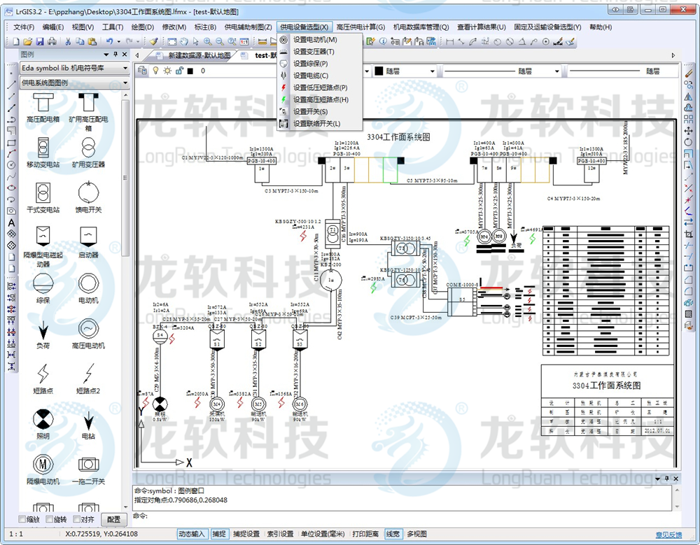 供電設(shè)計(jì)圖形協(xié)同管理系統(tǒng)包括機(jī)電圖形協(xié)同管理、供電設(shè)備選型計(jì)算和固定設(shè)備選型計(jì)算等模塊。機(jī)電圖形協(xié)同管理是基于一張圖管理模式,以在線協(xié)同的方式設(shè)計(jì)運(yùn)輸系統(tǒng)圖、設(shè)備布置圖、供排水系統(tǒng)圖、通訊聯(lián)絡(luò)系統(tǒng)圖、人員定位系統(tǒng)圖、供電系統(tǒng)圖等機(jī)電圖形。供電設(shè)備選型計(jì)算是基于標(biāo)準(zhǔn)的供電設(shè)備圖例庫(kù)繪制供電系統(tǒng)圖,對(duì)電動(dòng)機(jī)、變壓器、電纜、各類(lèi)開(kāi)關(guān)進(jìn)行相應(yīng)的供電計(jì)算與校驗(yàn),從設(shè)備參數(shù)數(shù)據(jù)庫(kù)選出合適的供電設(shè)備,并自動(dòng)生成供電設(shè)計(jì)報(bào)告。固定設(shè)備選型計(jì)算是對(duì)輔助運(yùn)輸巷絞車(chē)、運(yùn)輸機(jī)、排水等設(shè)備進(jìn)行選型計(jì)算,選出合適的設(shè)備,生成相應(yīng)的設(shè)備選型設(shè)計(jì)報(bào)告。