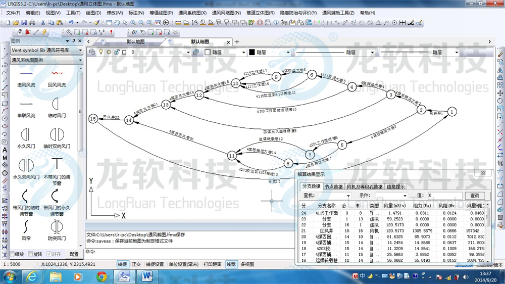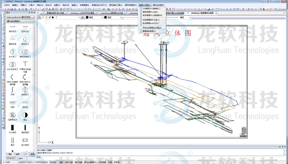 通防圖形協(xié)同管理系統(tǒng)主要包括通風(fēng)制圖和通風(fēng)系統(tǒng)仿真等模塊。通風(fēng)制圖包括繪制通風(fēng)系統(tǒng)圖、避災(zāi)路線圖、注漿系統(tǒng)圖、瓦斯抽放系統(tǒng)圖、瓦斯抽放曲線圖、防塵系統(tǒng)圖、防火系統(tǒng)圖、監(jiān)測(cè)監(jiān)控系統(tǒng)圖,自動(dòng)生成通風(fēng)系統(tǒng)立體圖、通風(fēng)網(wǎng)絡(luò)圖、通風(fēng)系統(tǒng)壓能圖;通風(fēng)系統(tǒng)仿真主要包括通風(fēng)阻力測(cè)定數(shù)據(jù)的錄入和處理,通風(fēng)網(wǎng)絡(luò)模擬解算,通風(fēng)系統(tǒng)風(fēng)量調(diào)節(jié),風(fēng)機(jī)優(yōu)化選型等功能。