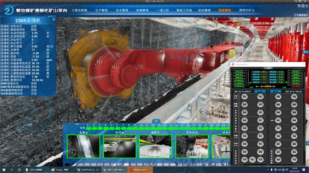 (5)基于TGIS“一張圖”的智能管控平臺(tái)。平臺(tái)采用地理信息系統(tǒng)(GIS),通過(guò)GIS系統(tǒng)實(shí)時(shí)集成顯示工作面煤層地質(zhì)信息、綜采設(shè)備運(yùn)行位置、人員定位信息,實(shí)時(shí)獲取工作面空間地理信息與設(shè)備運(yùn)行狀態(tài),實(shí)現(xiàn)工作面智能化管理與控制;平臺(tái)基于可視化腳本編程功能實(shí)現(xiàn)對(duì)工作面設(shè)備的數(shù)字孿生管控;實(shí)現(xiàn)在地面調(diào)度室常態(tài)化一鍵啟停三機(jī)、采煤機(jī)自適應(yīng)截割、液壓支架自動(dòng)跟機(jī)等遠(yuǎn)程控制功能;實(shí)現(xiàn)三維地質(zhì)模型可視化展示,并與各類機(jī)電設(shè)備三維模型及其運(yùn)行狀態(tài)高度集成。