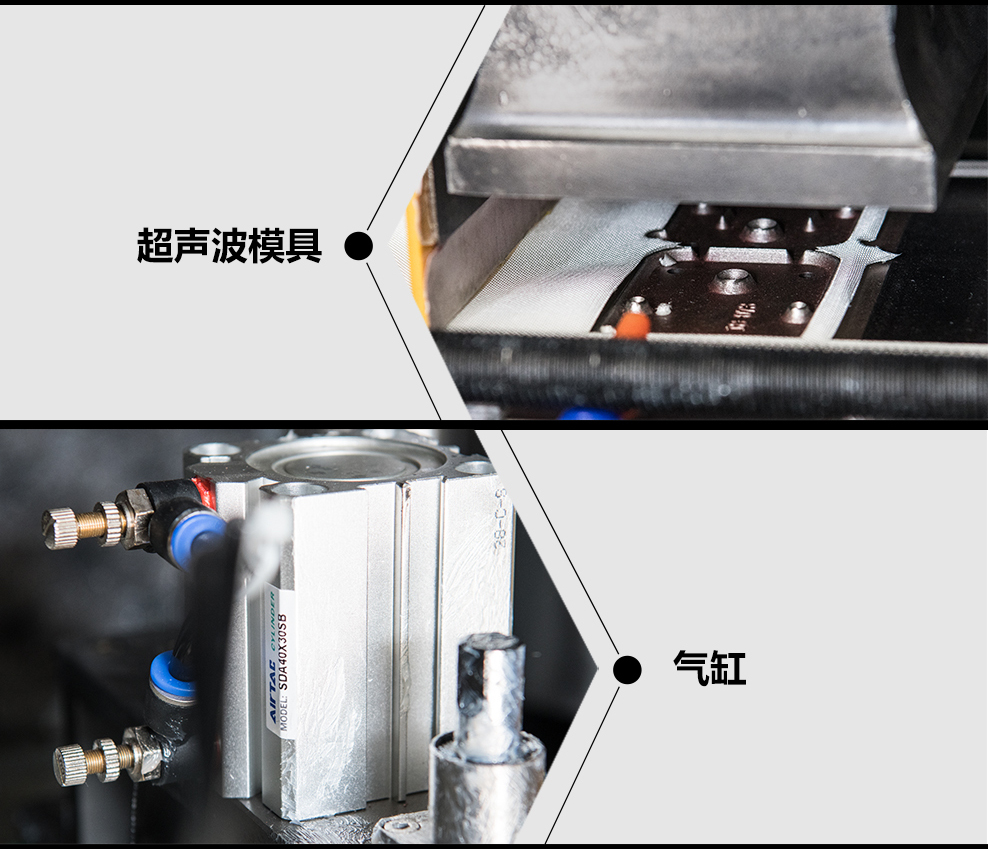 2.設(shè)備采用大功率15KHz超聲波工作并配合增壓缸進行下壓沖切,沖切力度大。