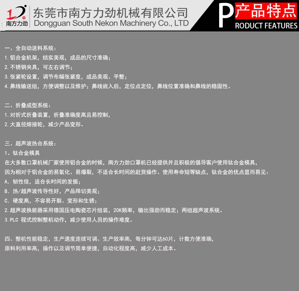 東莞市南方力勁機(jī)械有限公司是一家大型超聲波設(shè)備生產(chǎn)企業(yè),主營(yíng)全自動(dòng)口罩機(jī),平面口罩機(jī),折疊口罩機(jī),杯型口罩機(jī),柳葉型口罩機(jī),超聲波裥棉機(jī),汽車腳墊壓花機(jī),超聲波剪切機(jī),超聲波分條機(jī),超聲波花邊機(jī),超聲波縫合機(jī),超聲波釘珠機(jī),皮革沖孔機(jī),條形帽機(jī),鞋套機(jī)等設(shè)備,同時(shí)可為客戶提供非標(biāo)定制的自動(dòng)化設(shè)備,是國(guó)家高新技術(shù)企業(yè)。聯(lián)系電話:400-600-8299
