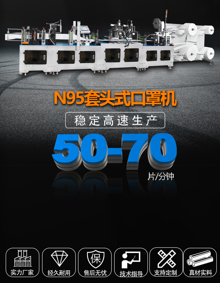 南方力勁頭套式KN95口罩機采用一體化機型設計,實現(xiàn)全自動化生產(chǎn),每分鐘產(chǎn)能40-70個,是生產(chǎn)外科用KN95口罩的必選設備。